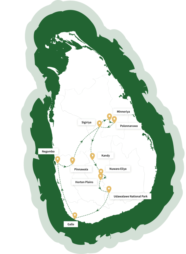Experience a diverse adventure filled with breathtaking nature and rich heritage. Begin with elephant encounters and the Sigiriya Rock climb, followed by visits to ancient ruins in Polonnaruwa. Immerse yourself in the cultural treasures of Kandy and the lush Peradeniya Botanical Gardens before hiking Horton Plains’ stunning landscapes. Wildlife safaris in Udawalawe and an exploration of the charming Galle Fort round off this enriching journey through Sri Lanka’s heartland.