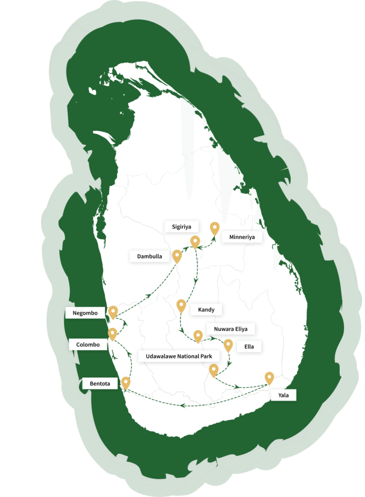 A journey rich in natural wonders and cultural highlights awaits families on this tour. Climb Sigiriya Rock, explore  botanical gardens, and experience tea plantations alongside waterfall visits. Enjoy safari adventures in Minneriya,  Udawalawe, and Yala National Parks, spotting a wealth of wildlife. The tour concludes with beach relaxation and nature  activities like turtle hatchery visits, creating lasting family memories.